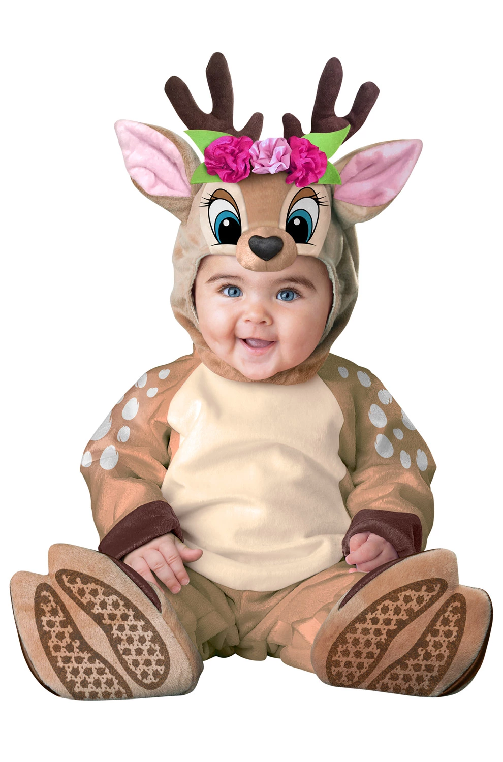 Now your baby can be an adorable woodland creature with this Darling Deer Infant Costume. This precious costume features a brown spotted jumpsuit and deer head hood with attached floral crown for a soft and sweet look. Your little deer is sure to be the cutest critter in the woods.