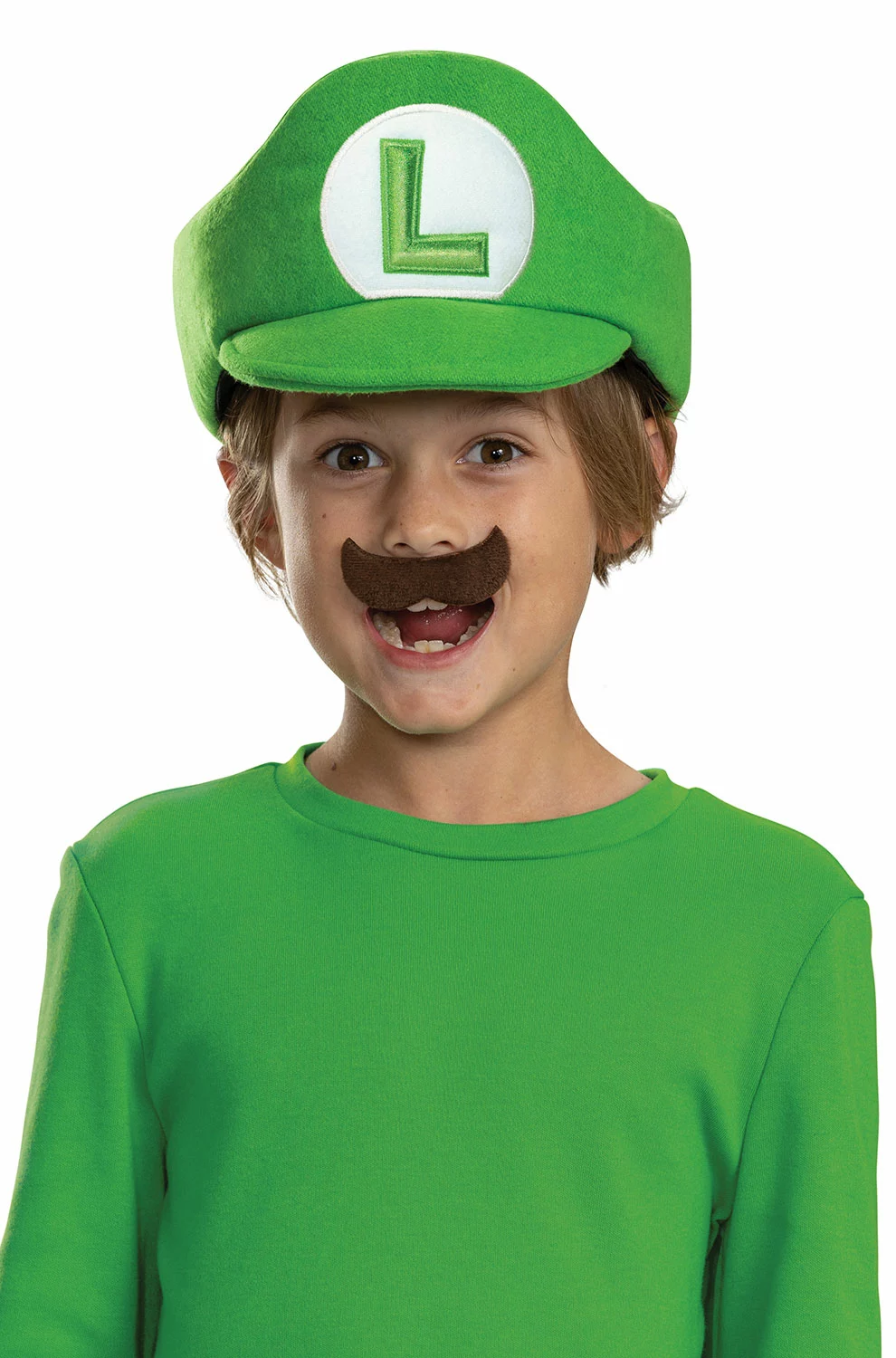 Some of the most distinguishing features of Luigi are his iconic hat and his glorious mustache. Make sure there’s no mistaking your costume with this Luigi Elevated Child Hat and Mustache. The green newsboy style hat features a prominent L emblem and the brown mustache is self-adhesive for easy application. Now your transformation is complete and you’re ready to team up with Mario to save Princess Peach!