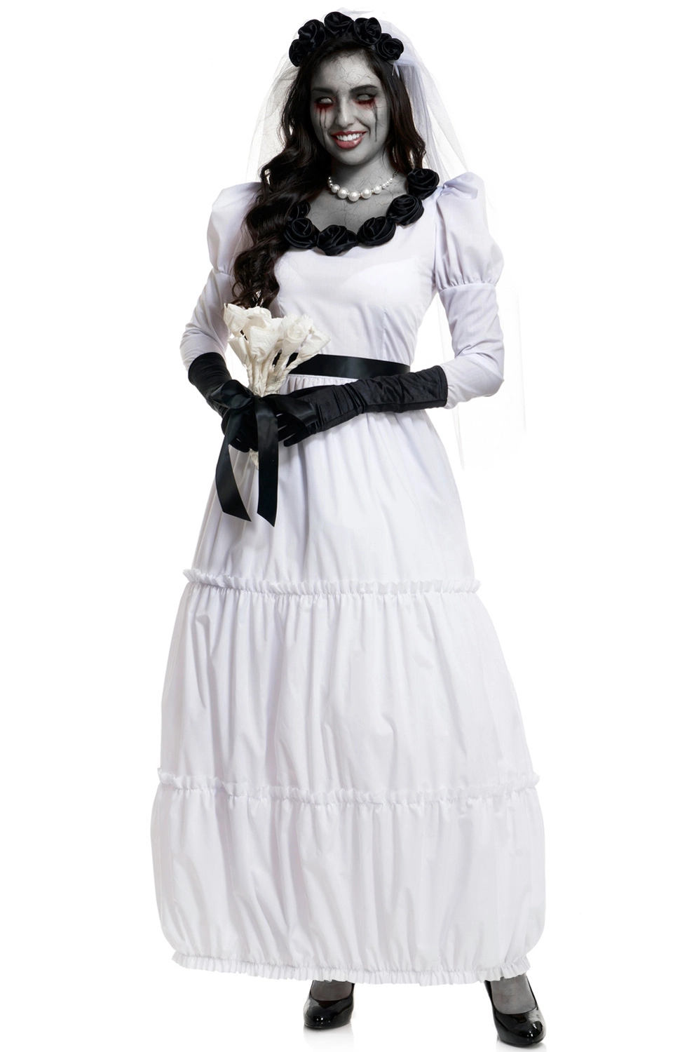 It’s the big day! No, not your wedding. Your costume party! Put a twist on the blushing bride look and show up in this Monster Bride costume for women. This dress has a beautiful Day of the Dead look that you can add onto with your own gory makeup.