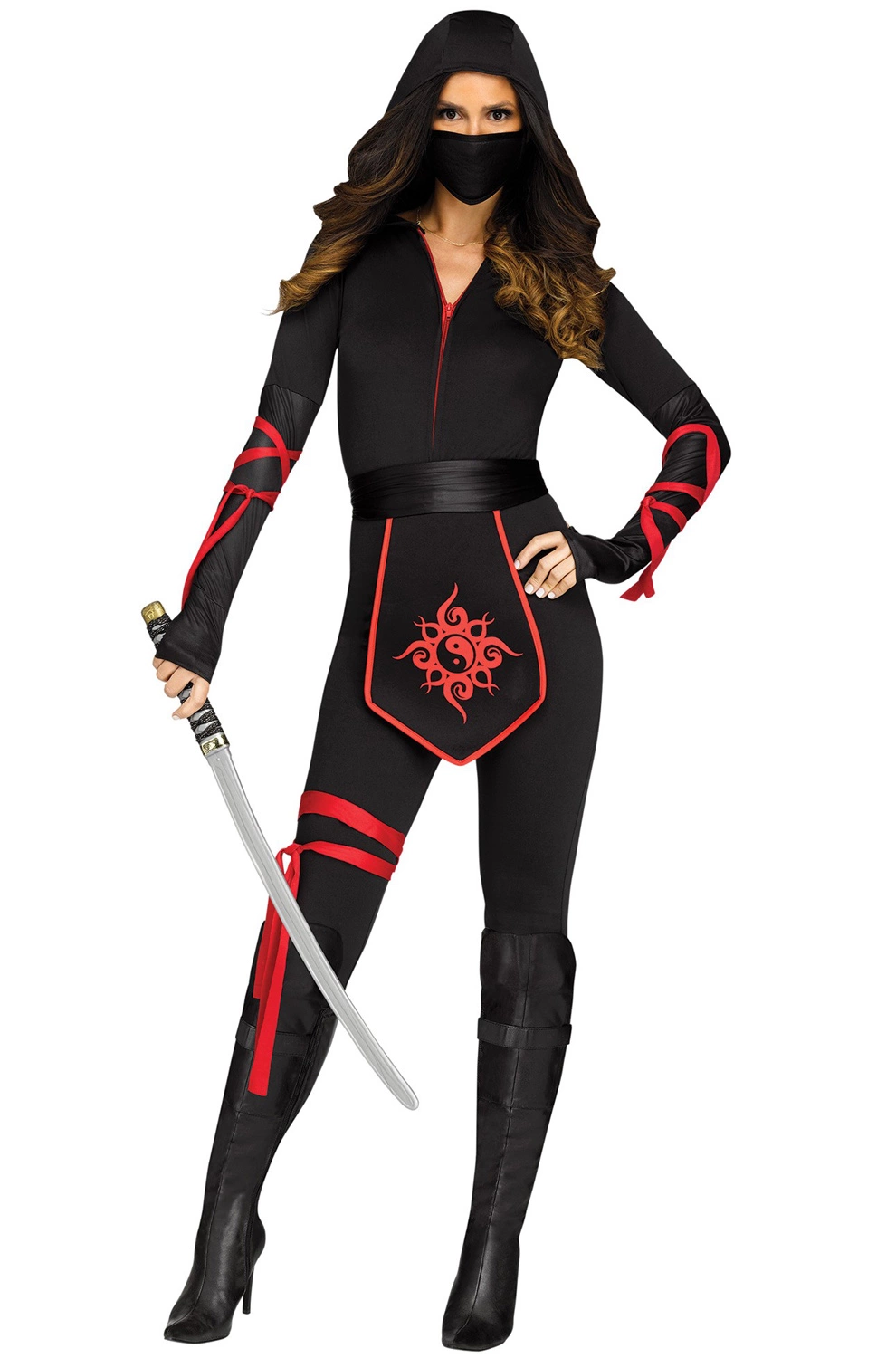 Ninjas are stealthy, skilled, and deadly assassins that can take your life at any moment. Now you can become a highly trained killer with this sleek Ninja Warrior costume for women. This black skin tight jumpsuit comes with red arm and leg ties, a tabard belt, and a mask for a sultry look that will entice any victim your way.