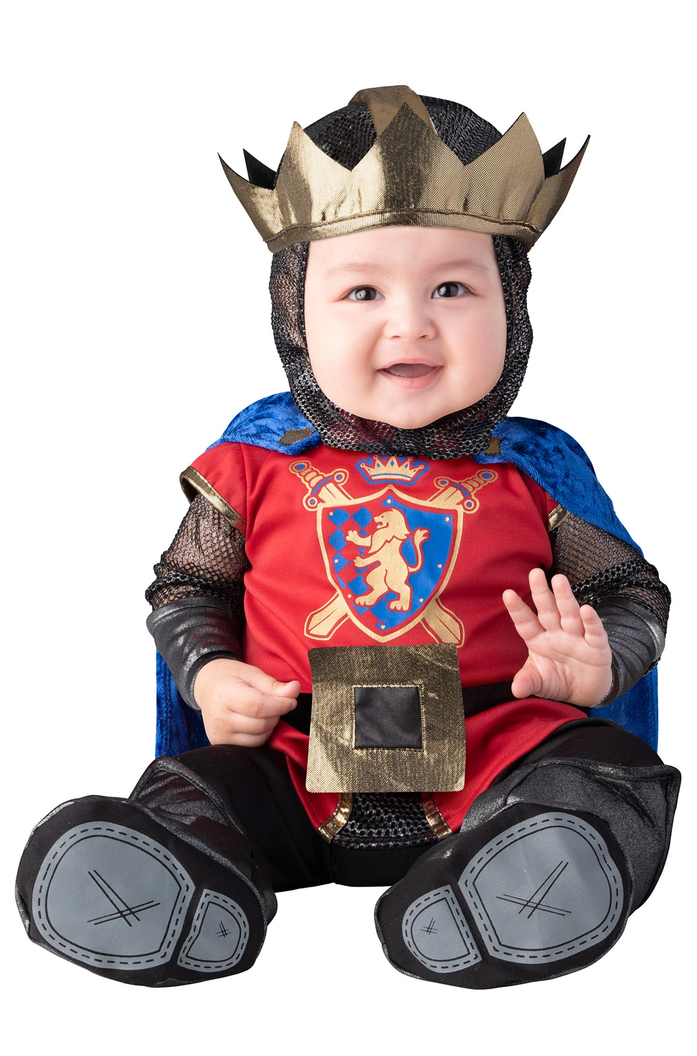 You may think a knight would only want to get in a battle but this cute knight only wants cuddles. This Sir Cuddles-A-Lot Infant Costume features a jumpsuit featuring a medieval red tunic with graphic emblem, netted faux chainmail sleeves, attached belt, and attached skid resistant boots. The costume also includes a rich blue velvet cape and a faux chainmail hood with golden crown.